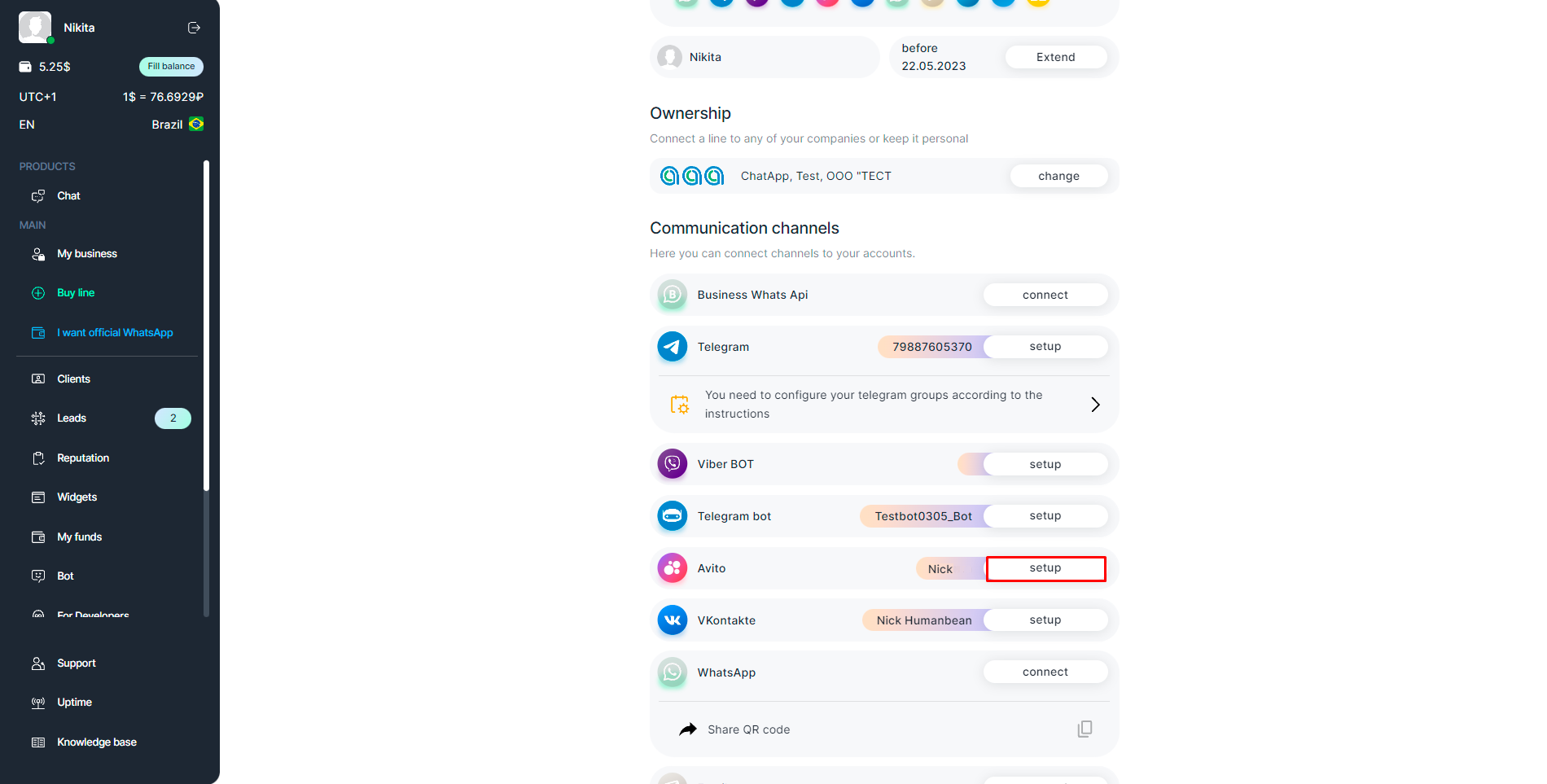 - In the “Selected company” section, open the line and click “setup” next to the connected Avito channel.