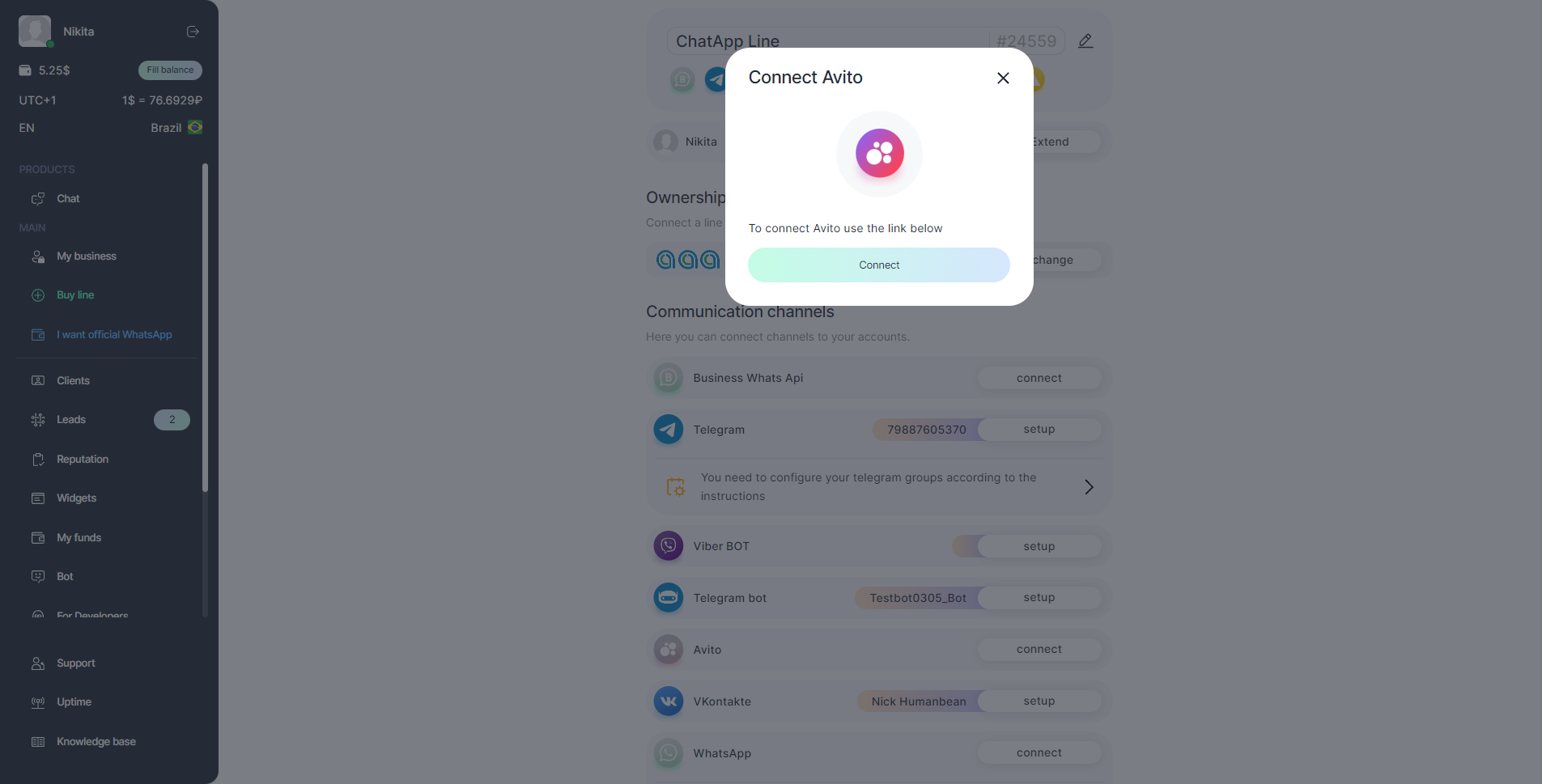 - Click connect to the right of Avito.