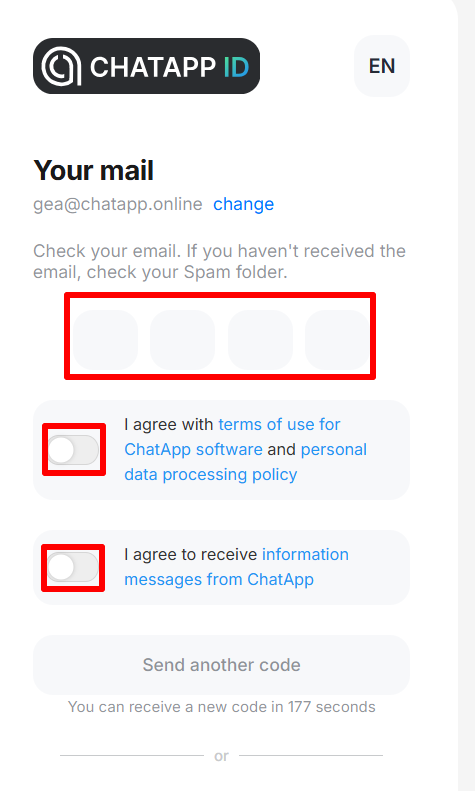 9. Confirm your login using the code from your e-mail or text message. Check the boxes to agree to ChatApp’s terms and conditions and data processing policy.