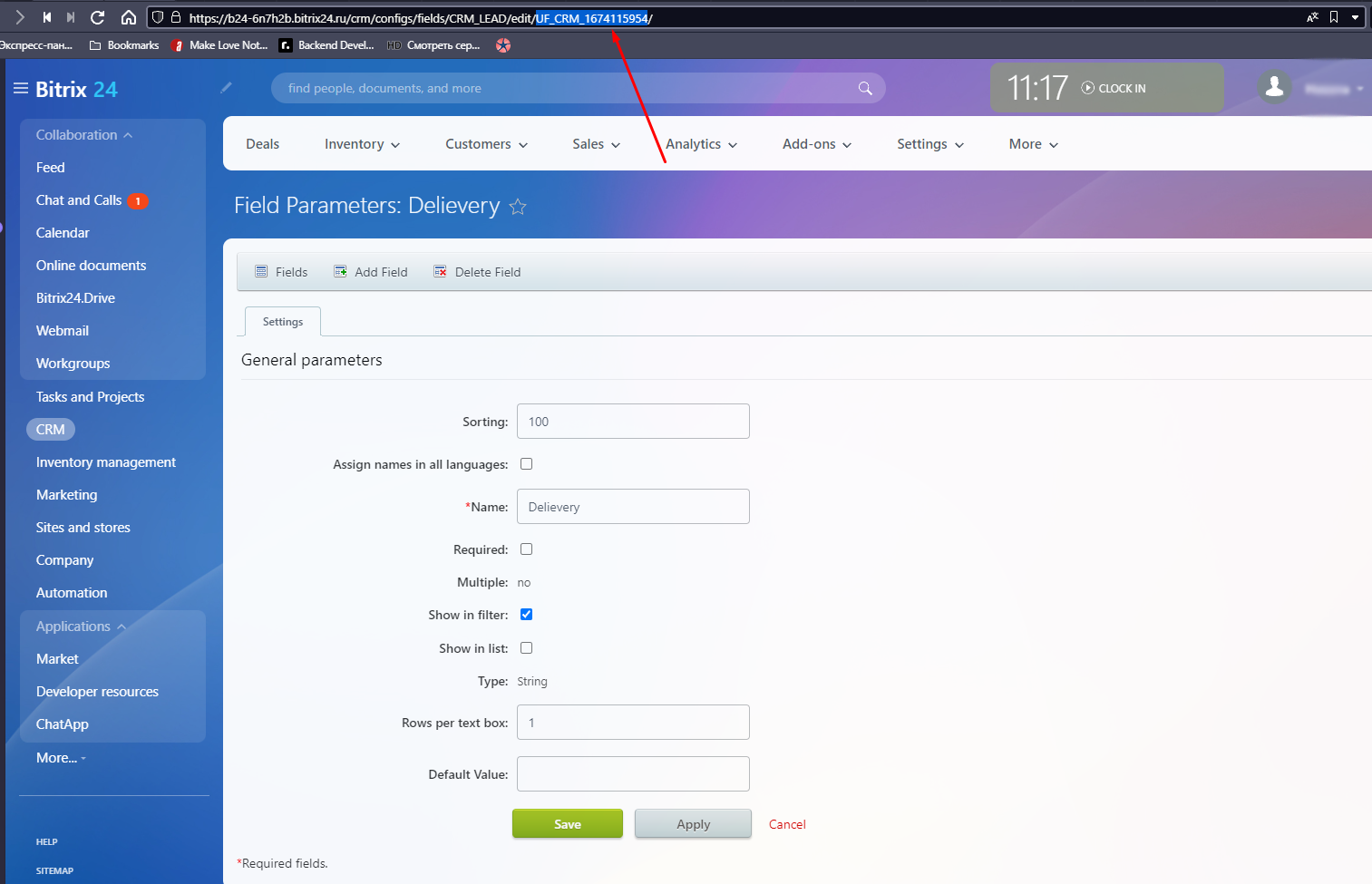 - In “key” enter “ID” and the field ID in Bitrix24, entered in square brackets [ ] so that Bitrix24 understands which card and which field to change.