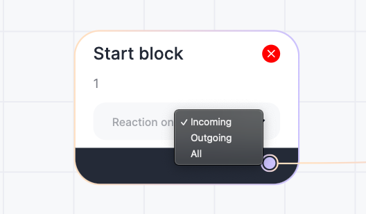 With this block, the bot understands where to start the conversation. If this block is missing, it is not clear, which action to do first. Therefore, you can’t create more than one start block or save the script without one.