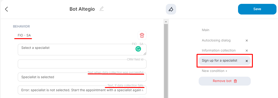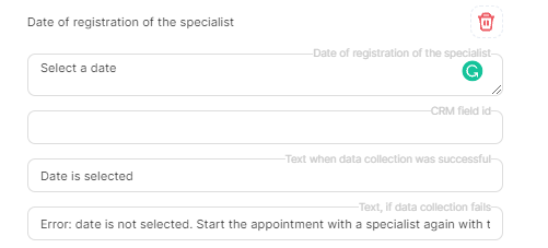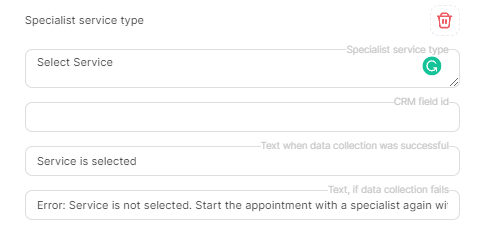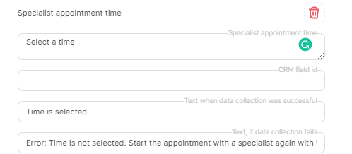 In the “Text, if data collection fails” field, write that the data was entered incorrectly, and tell the client how to start recording again. For example, Incorrect data was entered. Start an appointment with a specialist by writing Start again.