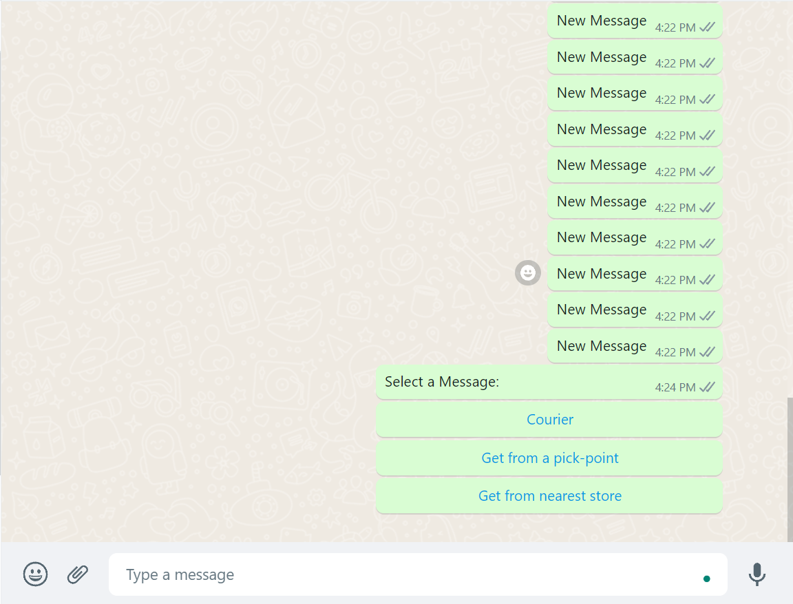 - A message with buttons must start with plain text. For example: ” Select one of the options: {{{{Option 1}}}{{{{{Option 2}}}}{{{{{Option 3}}}}}”. Otherwise, the message will not be sent.