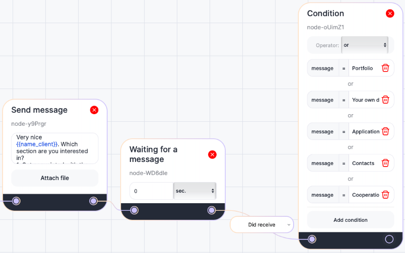 In the bot constructor, you can also add buttons to suggest that the client select an answer option. You can use buttons in any block that sends a message to the client.
