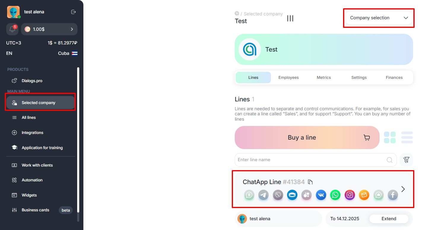 2. Select the desired company by clicking on Company selection in the upper right corner.