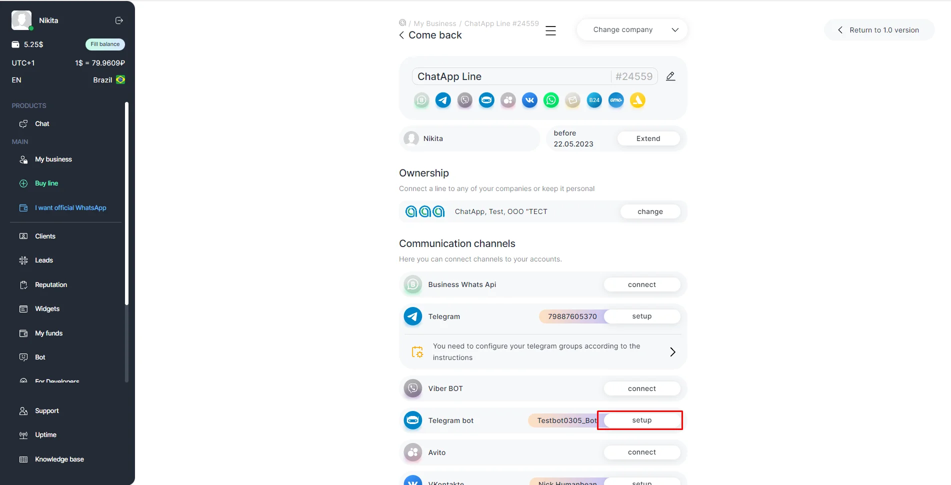 5. The username of the bot will be displayed in the line. Click on setup to view the token, name, username of the bot and get a link to the bot in Telegram.