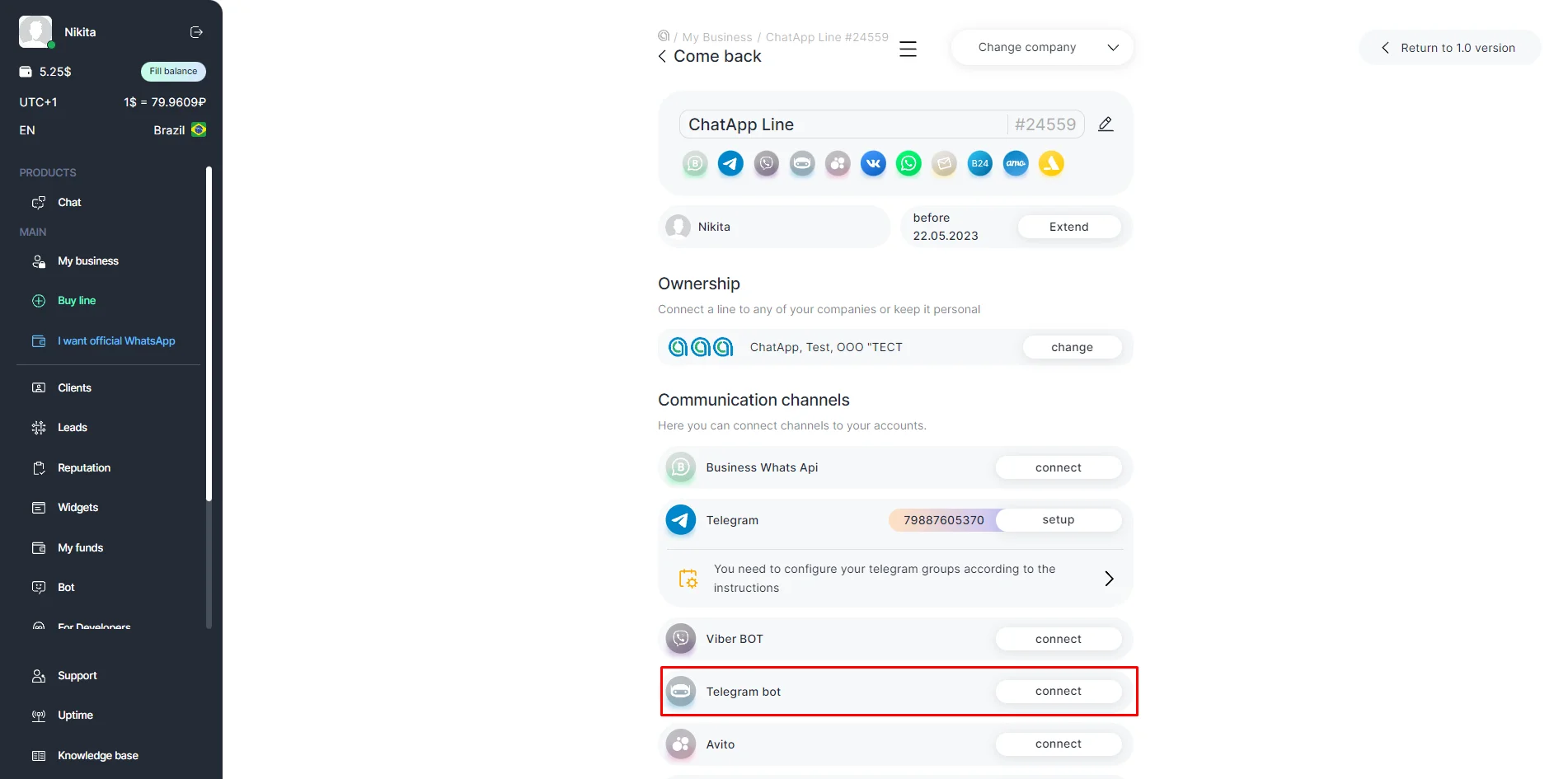 To connect Telegram bot to the ChatApp service: