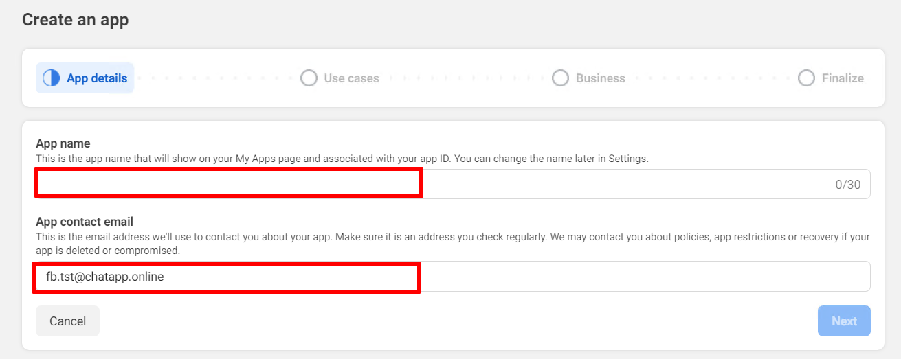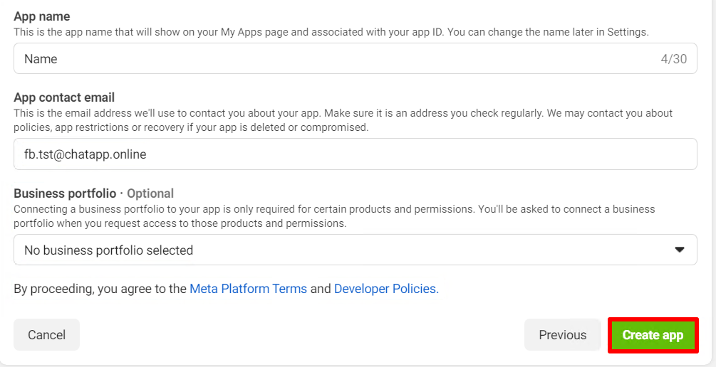 Important: if you have already created an application with a connected number and it is linked to a business portfolio to which you need to connect another number, do not create a new application. This will cause duplicate messages to both numbers authorized in the ChatApp account. Connect the number to the already created application.