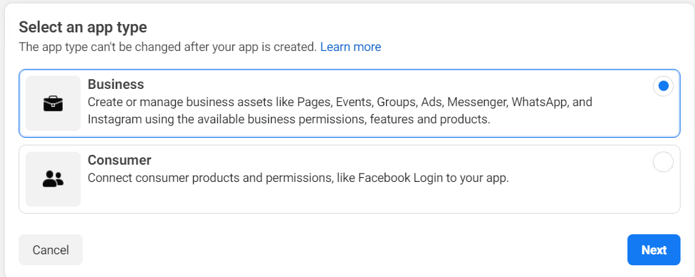 1) Go to the Meta for Developers page and create an application by selecting My Apps from the top menu.