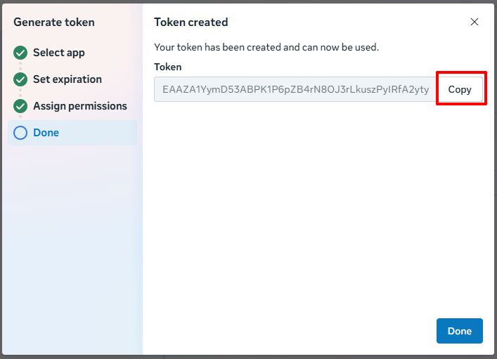 5) In the next window of the created token, copy and save the token.