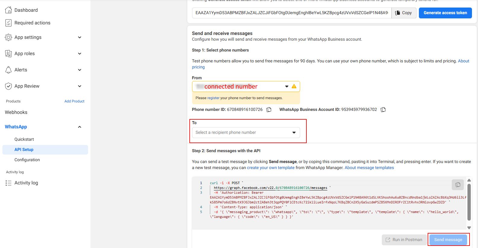 4. After successful token generation, send a test message by entering your personal WhatsApp phone number.
