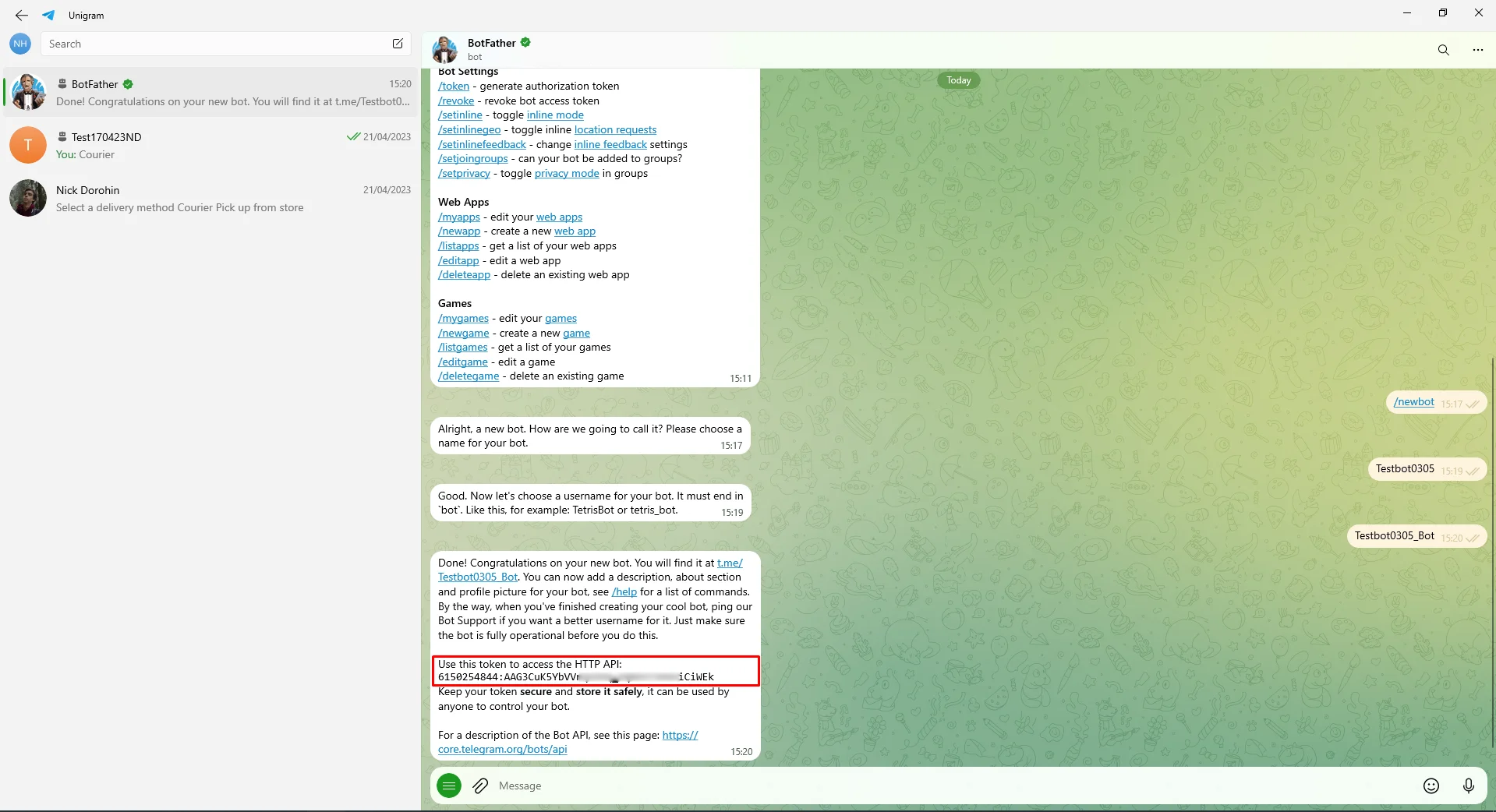 5. When all the data is entered, you will receive bot’s Token. This identifier is unique and contains all data about your bot. To maintain confidentiality, save it;