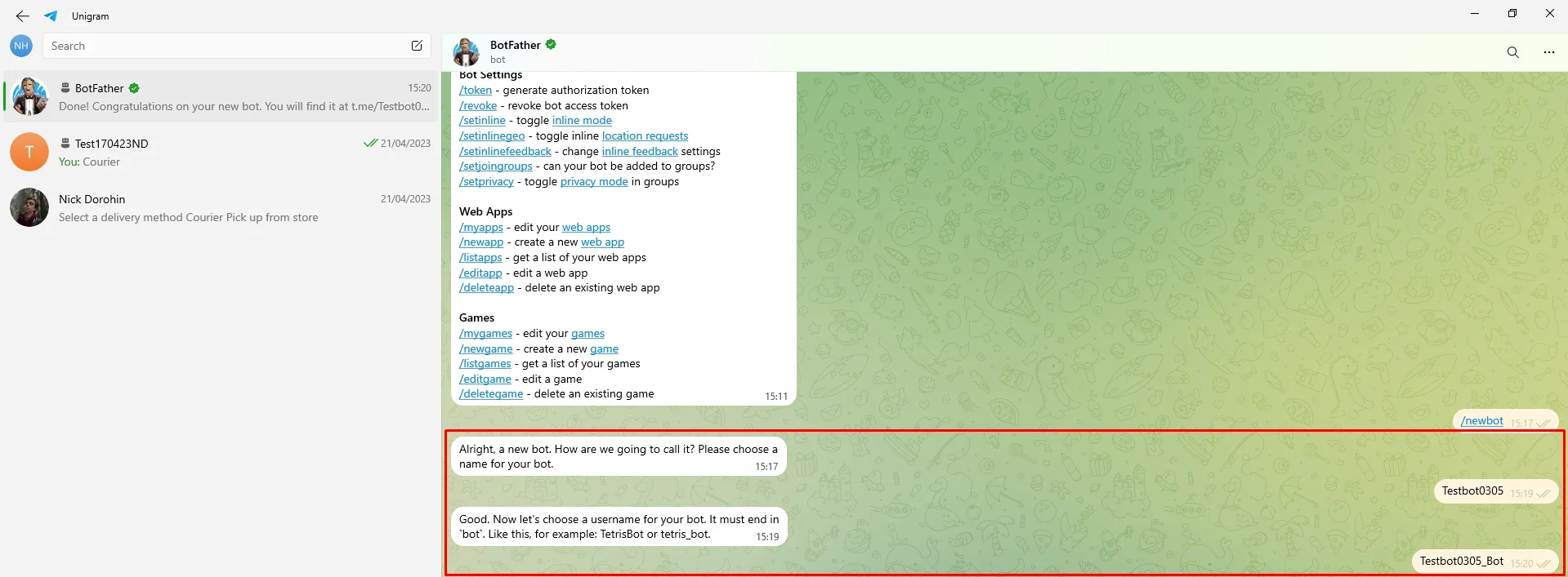 3. To create a new bot, enter a message with the text /newbot or select this item from the menu;