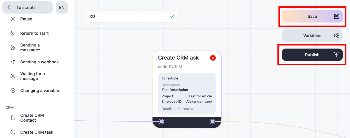Done! Now, when the scenario reaches this block, a task will be created in the CRM system.