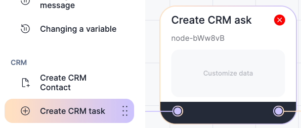 2. Take the “Create a CRM Task” block from the left menu and drop it on the workspace;