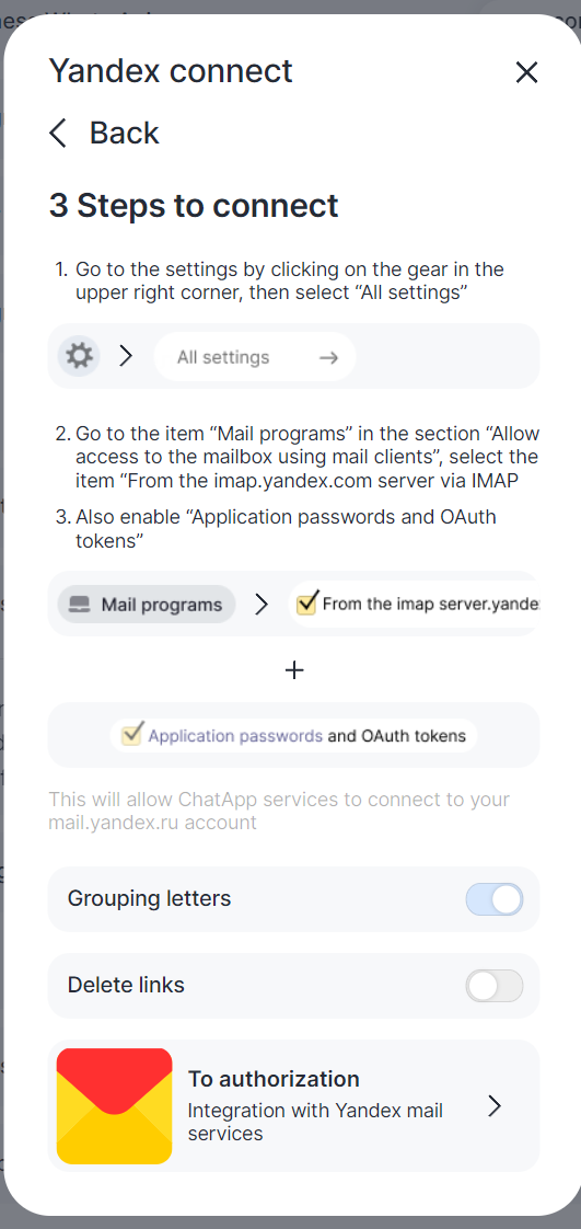 Go to Yandex mail and go to Settings -> Mail programs