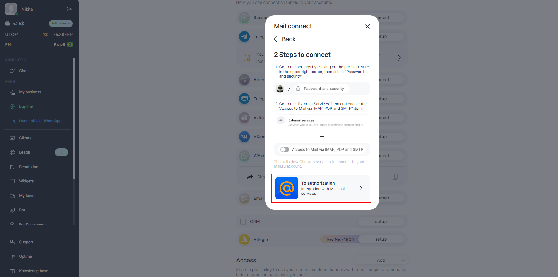 2. Click on Mail.ru and To authorize;