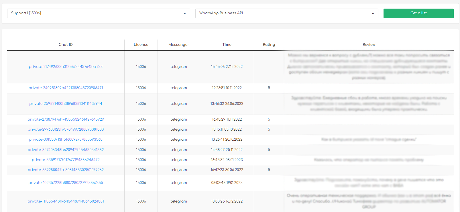 A list of all reviews and ratings for each individual line can be obtained by clicking on the Reviews and ratings tab of the main menu:
