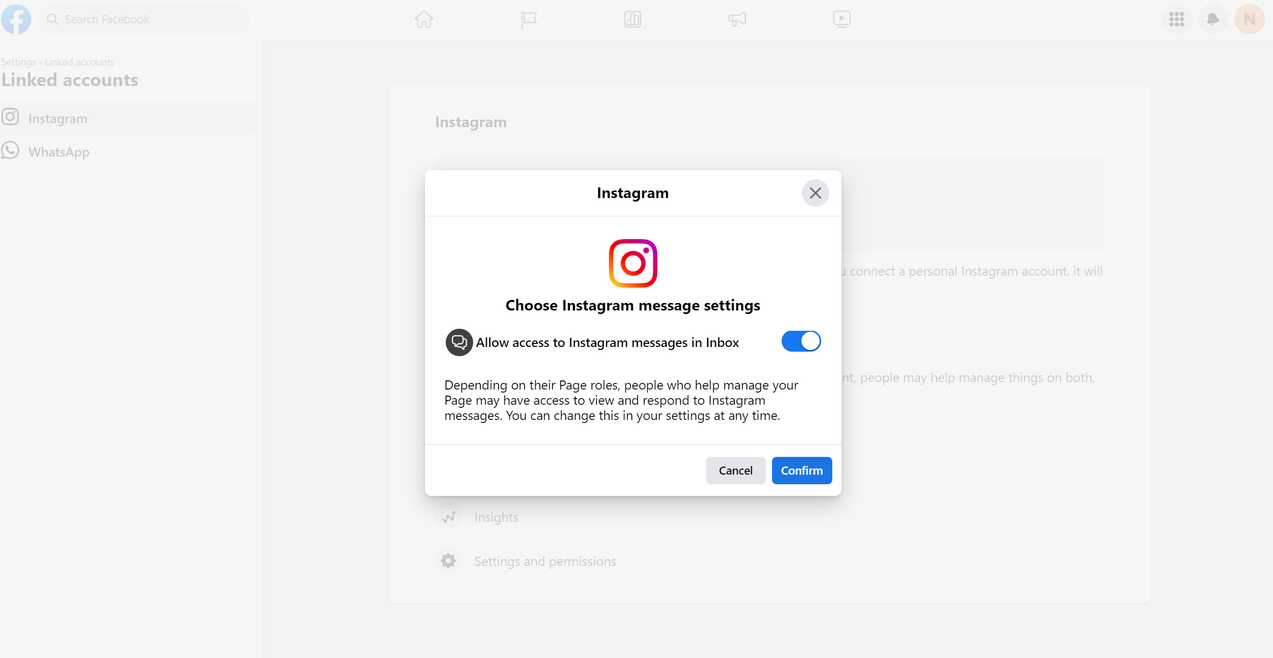 Enable “Allow access to Instagram messages in Inbox”.