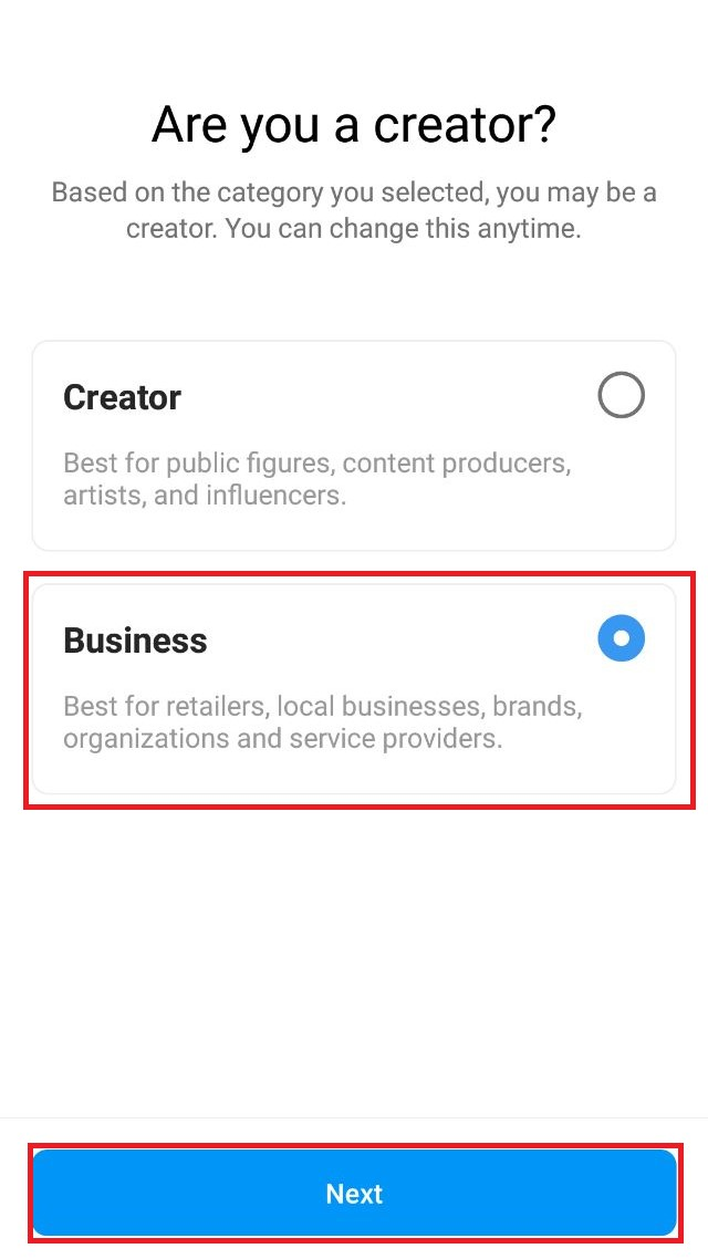 6. Select “Business” in the professional account type, and click “Next.”