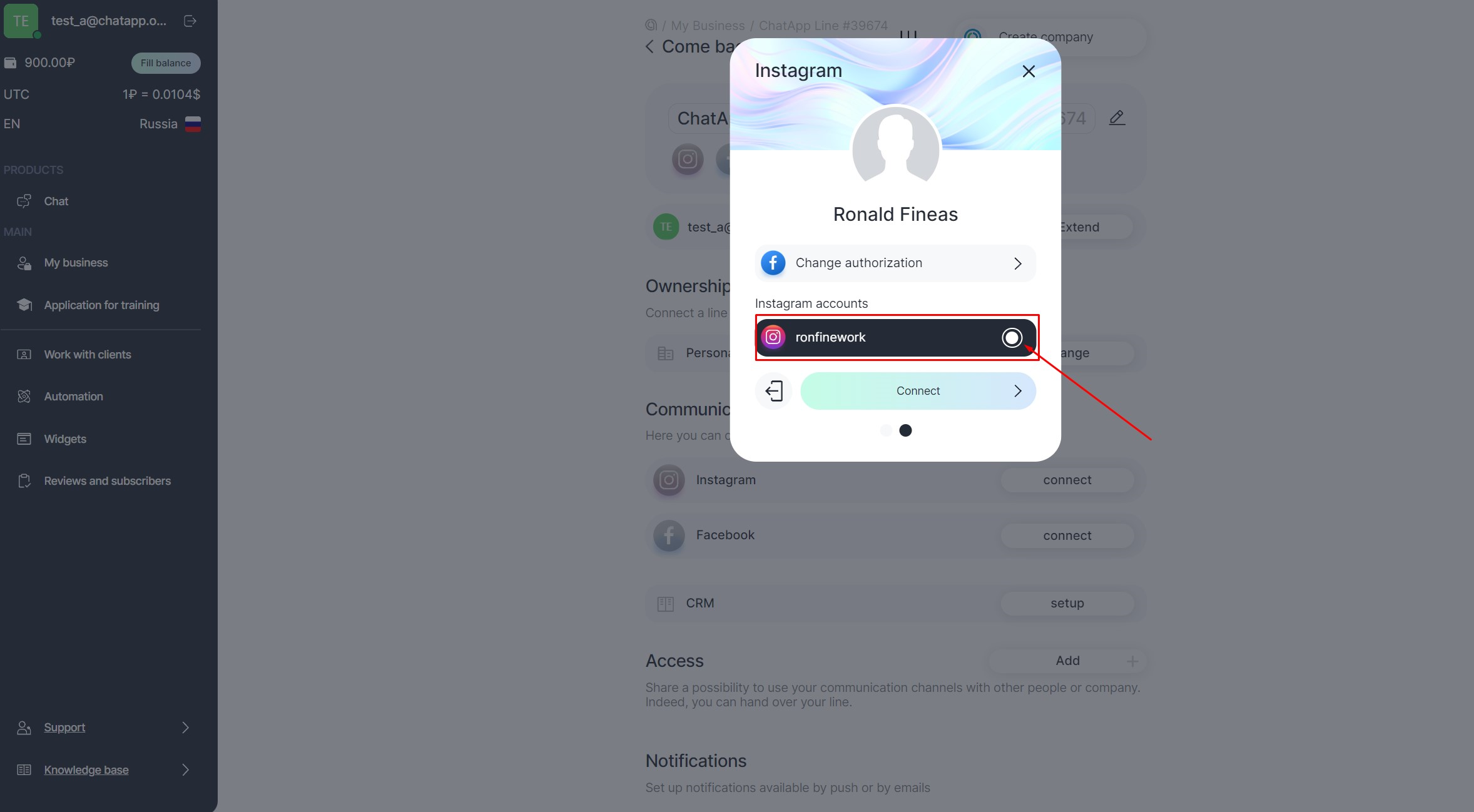 10. Select the Instagram* account you want to connect to the line and click Connect.