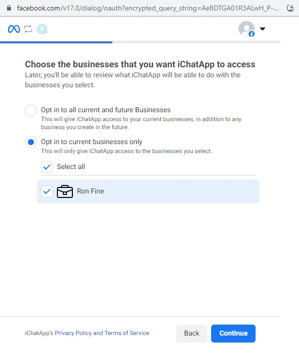 7. Select the Facebook* business page to which your Instagram business account is linked and click Continue. You can select multiple business pages.
