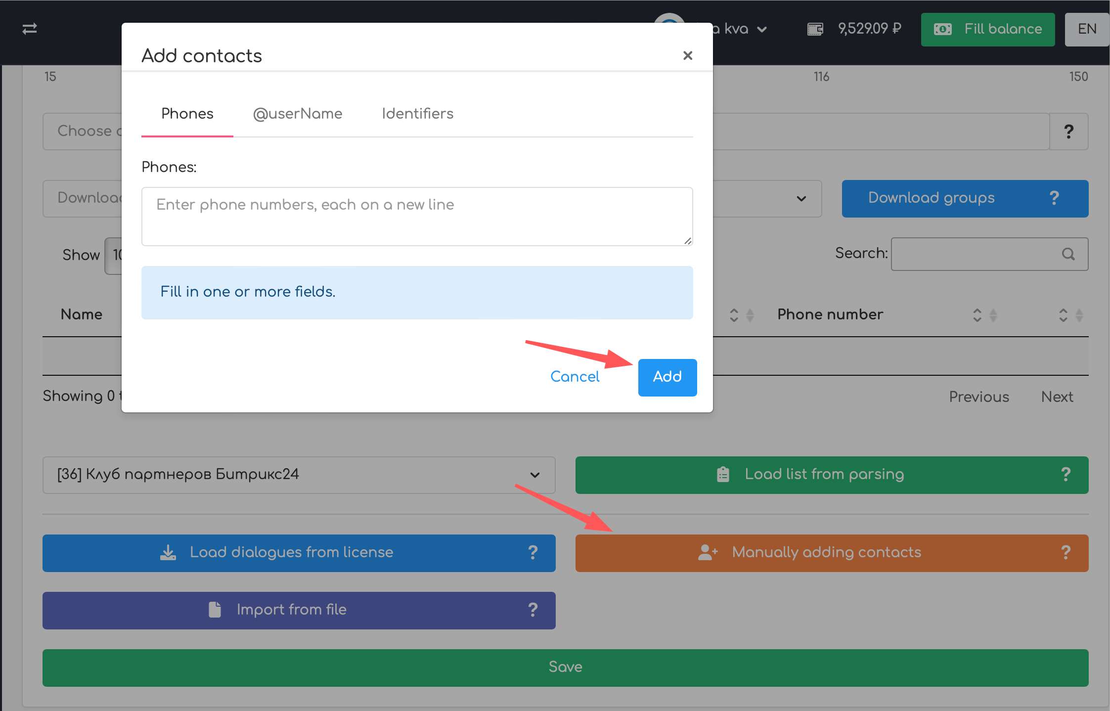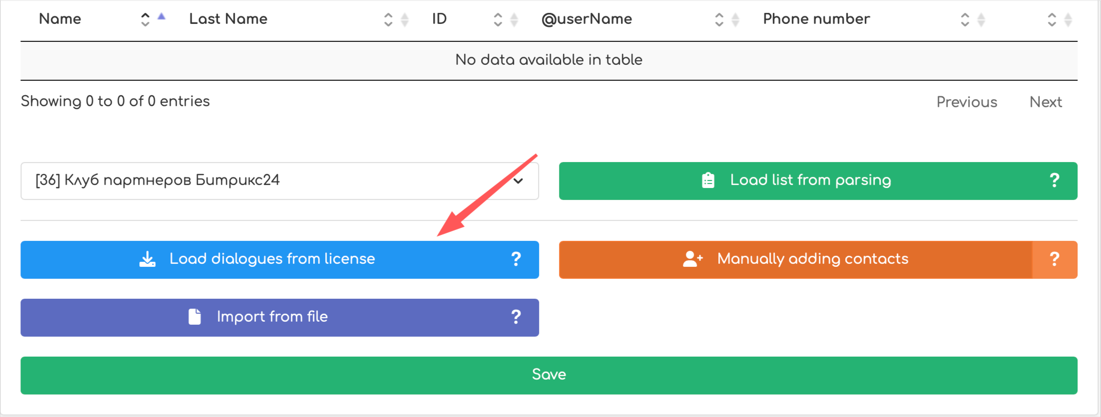 ► Load dialogs from license – To use this option, you first need to select a license in the corresponding field. All contacts with whom you had a dialogue from your Telegram or WhatsApp account will be added to the table.