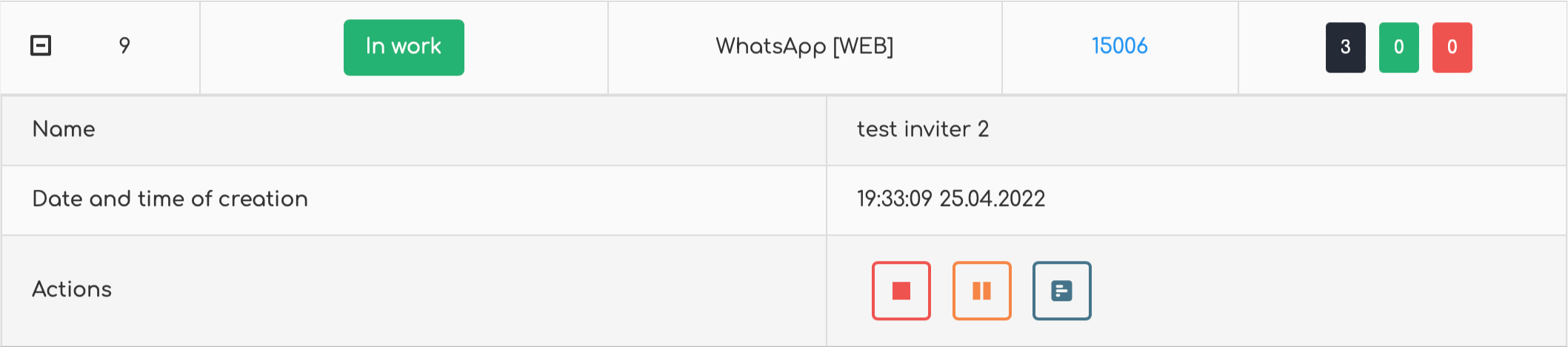 After setting up the Invater and saving the record, go to the Control Menu and use the function buttons. You can Start the Inviter, Pause its work with the option to continue, or Stop its work altogether.