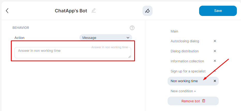 3. Create the Non-Working Hours condition. Write the text of the answer, and the bot will send the text to the user who applied on the day off.