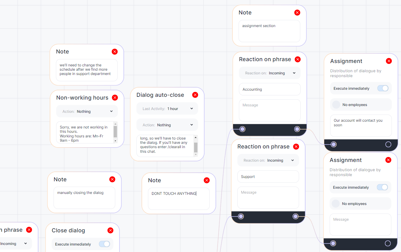 Use the ‘Note’ block to make it easier for you to navigate through a complex script with many branches, separate chains, and stand-alone blocks. This block does not affect the script and can be used for communication within the team. This is especially important when more than one person is working on the bot at once.