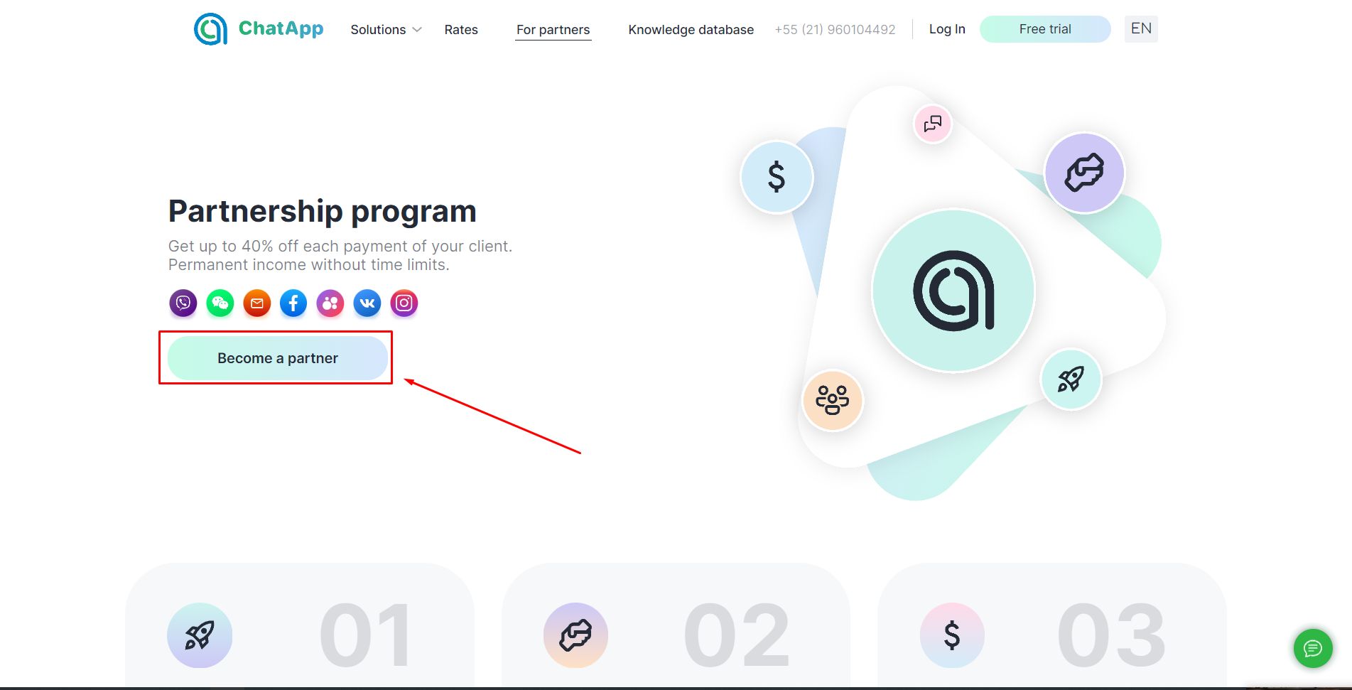 Become a partner of ChatApp and receive a discount of up to 40% discount on payments for any products from attracted customers — without time limits. We provide partners with training, support, and a personal account with tools for promotion and performance analysis.