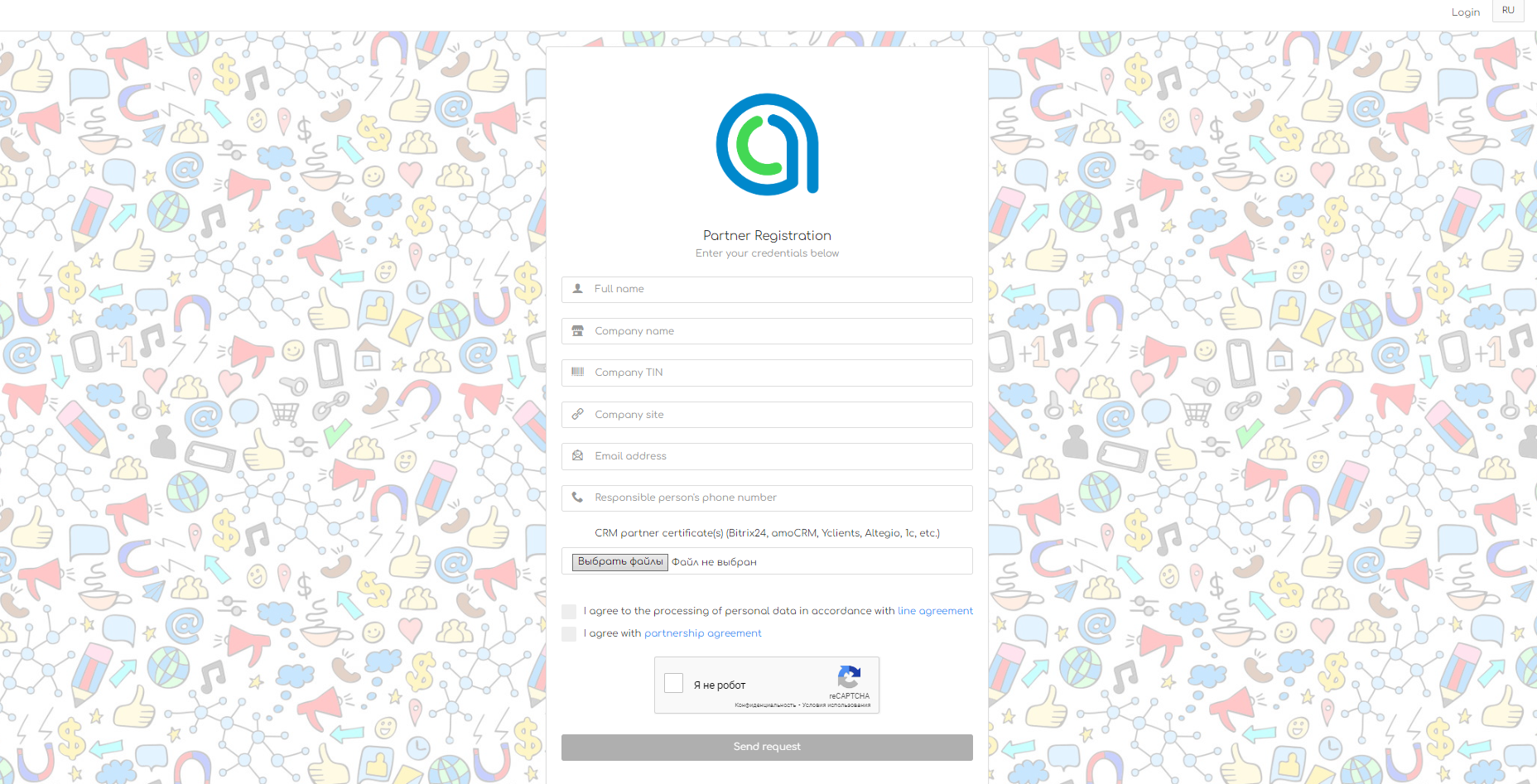 3) Check the box to agree to the processing of personal data and to the terms of the license agreement, verify, and click on the “Send Request” button.