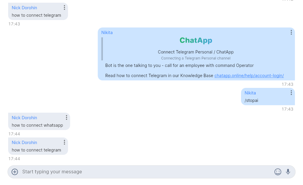 - To stop the Bot for the current session with the client, write the /stopai command in strictly lowercase.