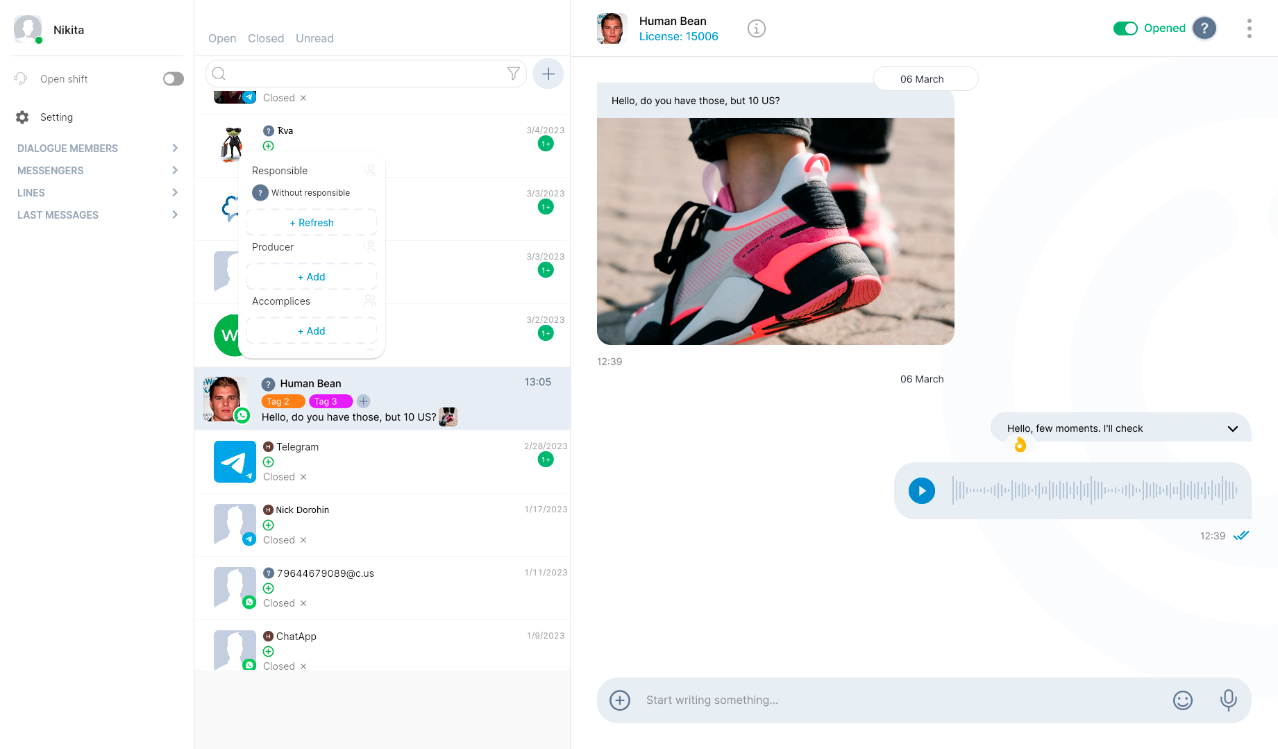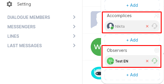 In the left menu in the “dialogue members” section, select an employee to view the dialogues in which he works:
