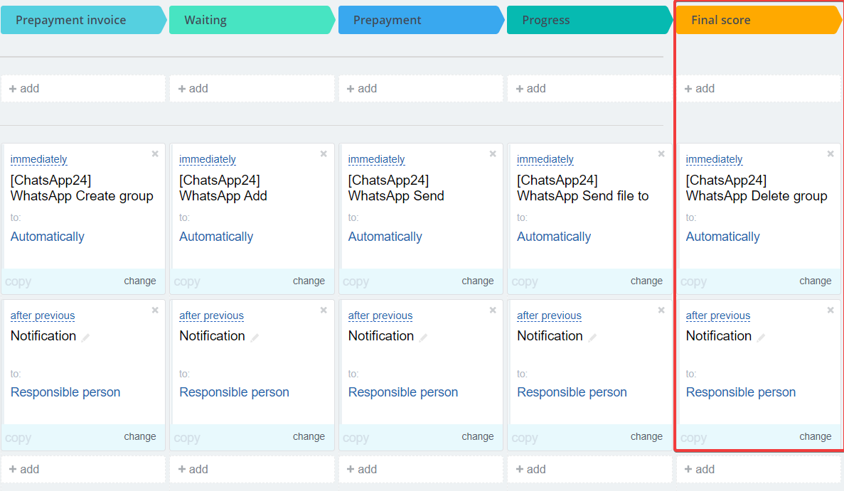- Add the for the transaction, for example, at the Final score stage. Use the standard procedure for setting up ChatApp automation rules.