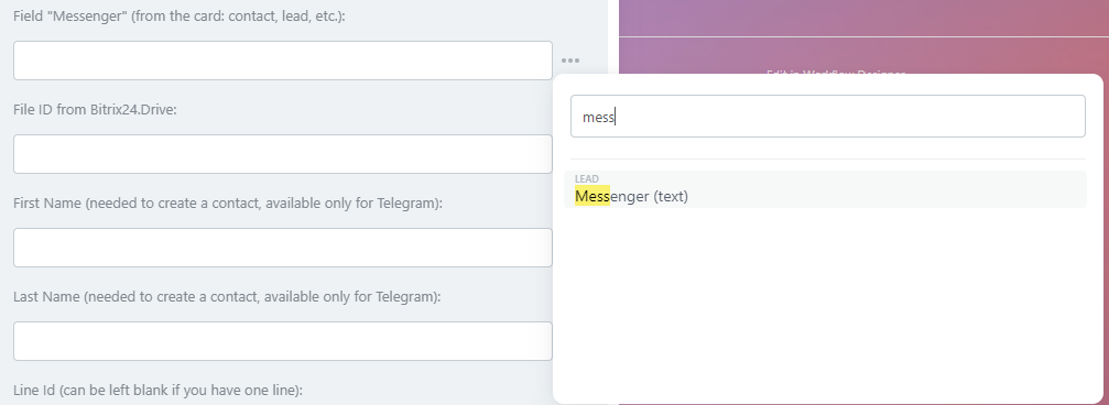 Messenger – here you need to specify the “Messenger” field from the deal card or lead via the field mask. This field is required when the contact’s phone number or other details are not available.