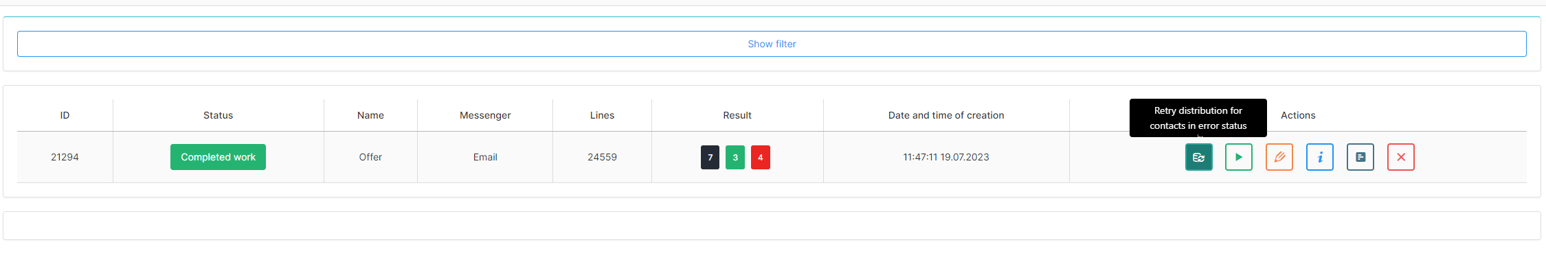 If during the mailing some messages were not sent due to an error, you can repeat the mailing by clicking on the “Retry distribution for contacts in error status” button.