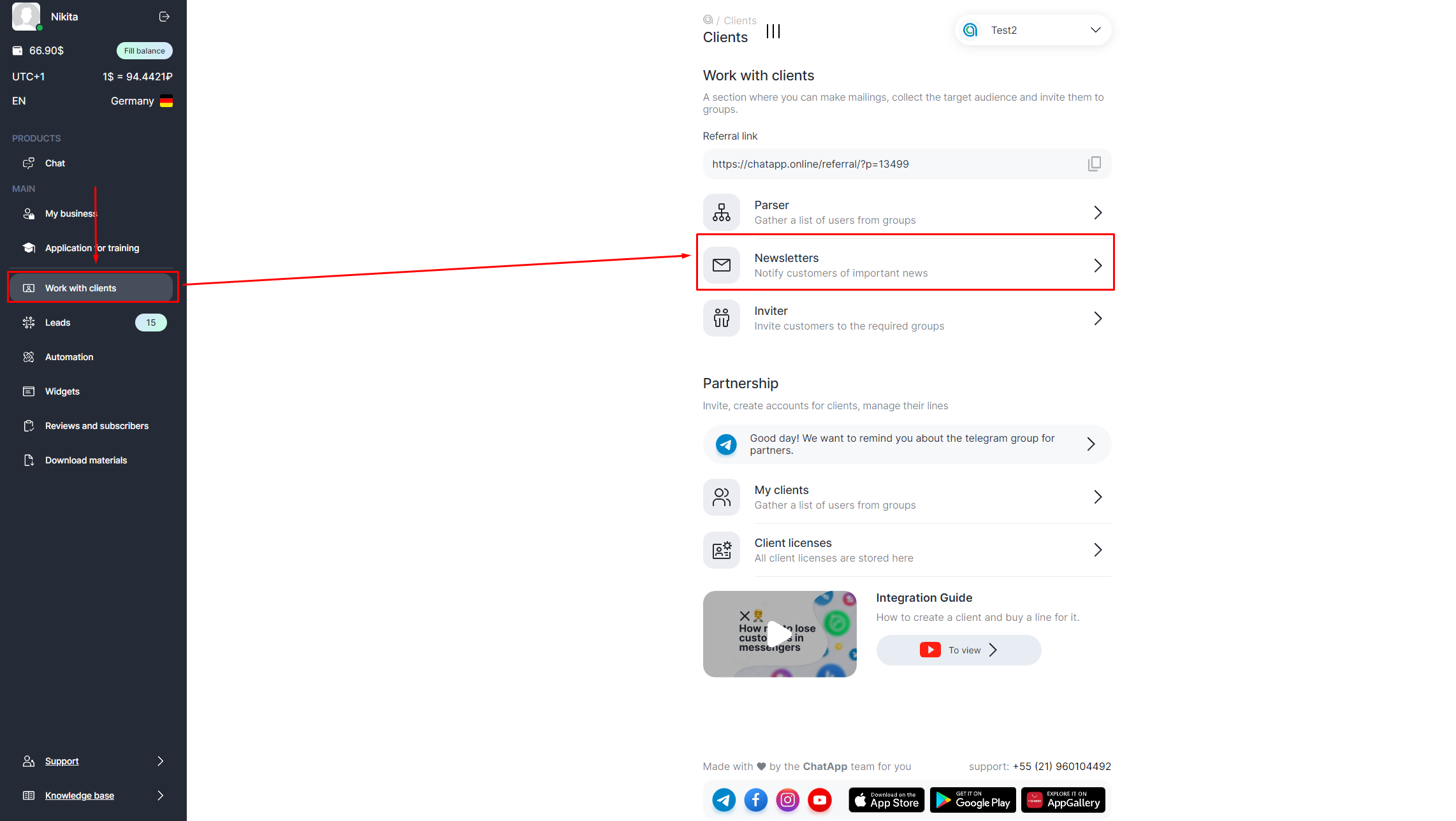 1. Go to your personal ChatApp account, select “Work with clients” in the left menu.