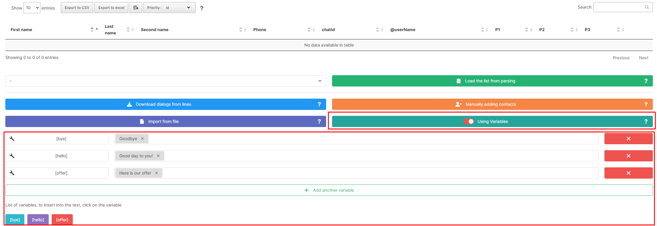 6. You may use variables in the message text. For substitution of pre-defined phrases to the text: