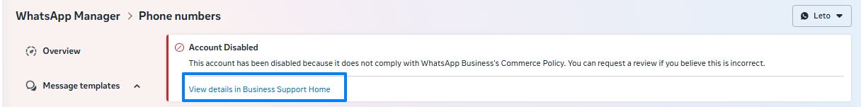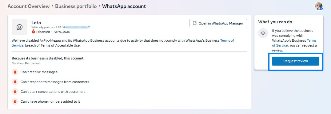 Filing an appeal when blocked WhatsApp Cloud API