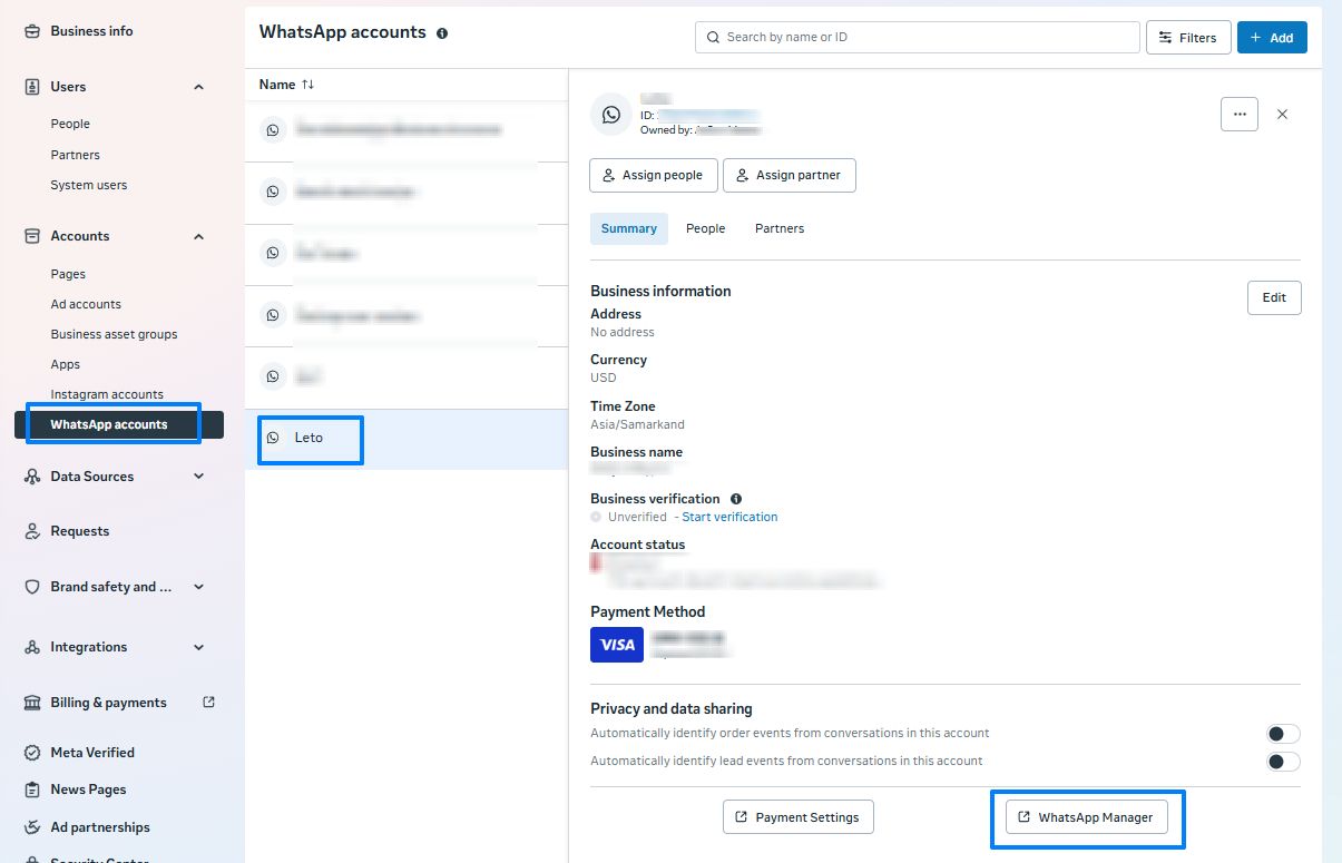 1. Go to “WhatsApp Accounts”, select the desired account and click “WhatsApp Manager” in the lower right corner.