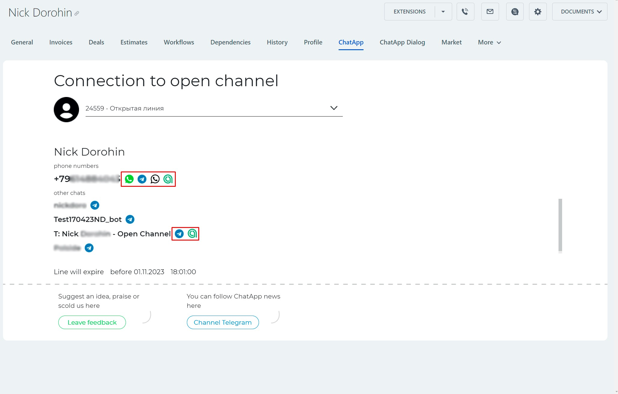 4. Go to the ChatApp tab and click on the Telegram icon. You can open a dialog with a client in ChatApp Dialog by pressing
