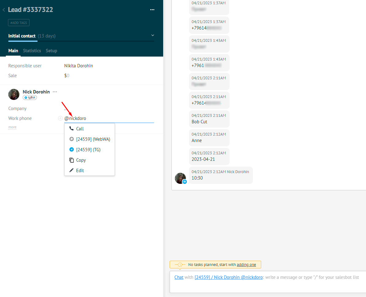 Let’s see an example – to write first from Bitrix24 in WhatsApp to the user from the created deal: