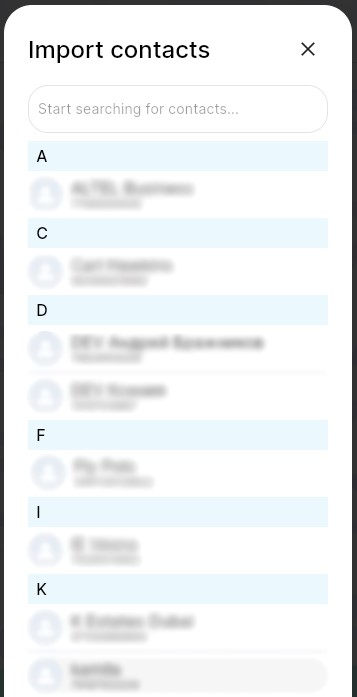 - If you click on the WhatsApp or Telegram button, a list of contacts from these messengers will open. Available messengers will be displayed in the Import contact section