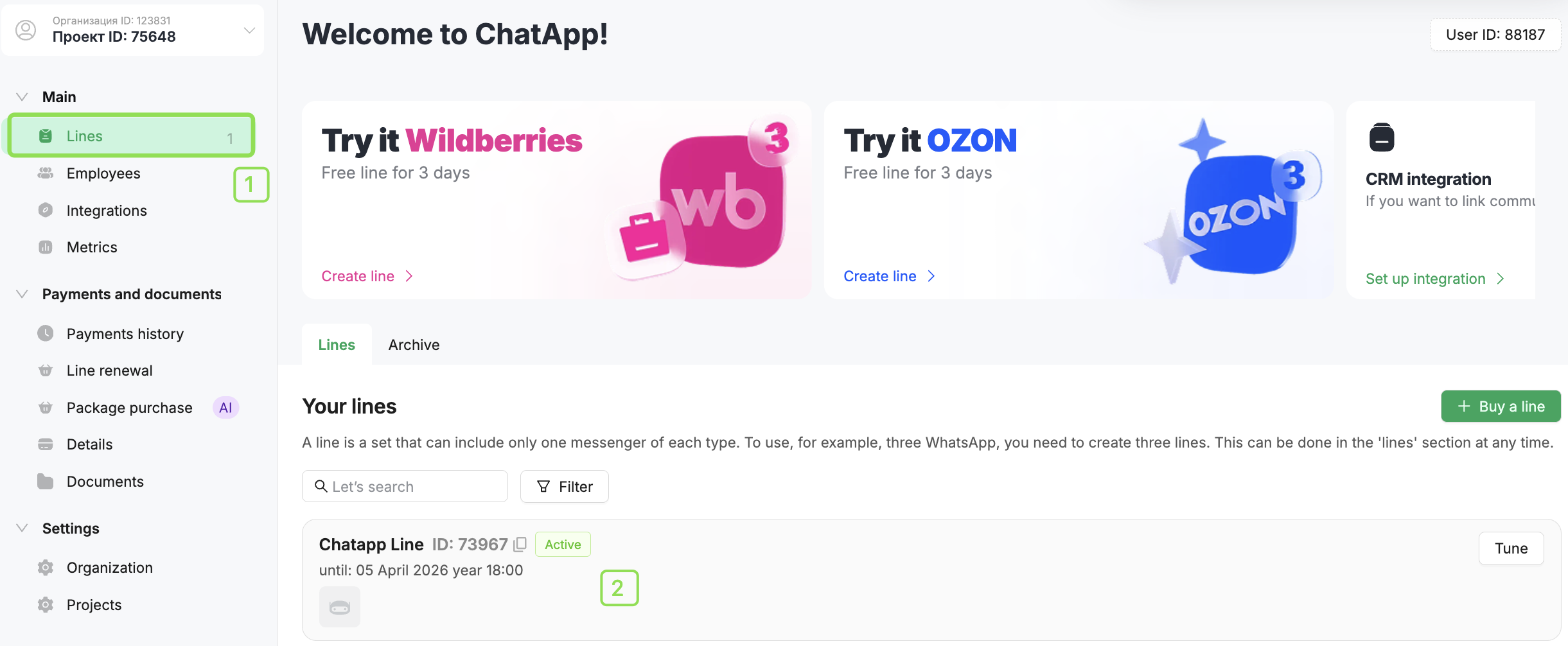 Step 1. In your personal account, open the “Lines” section and select the line with the Telegram Bot channel — the line settings window will open.