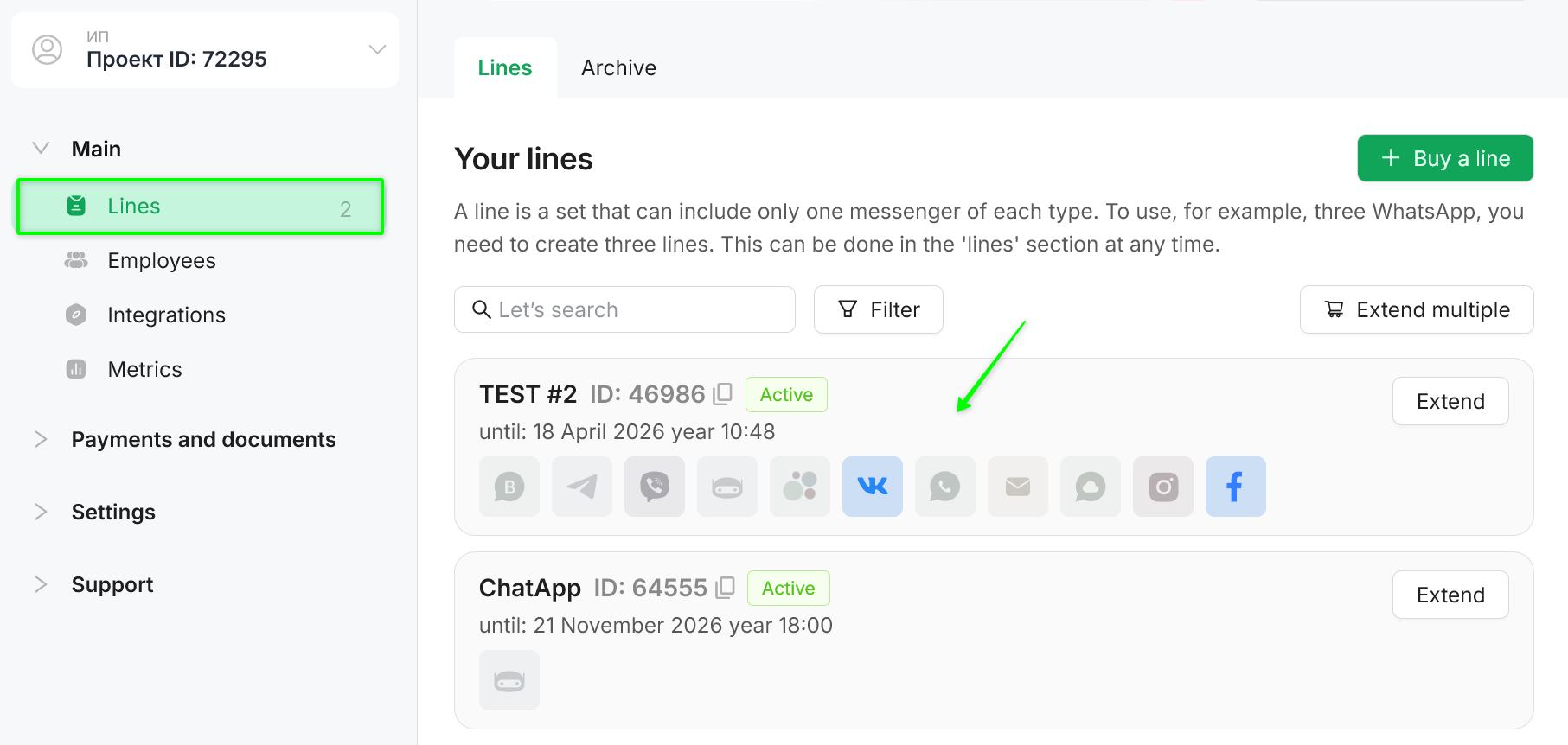 To open the line settings, select the «Lines» section in the left-hand menu, then choose the line you want to configure.