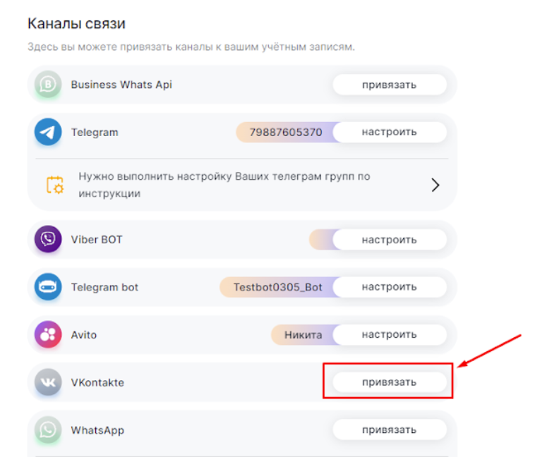 2. Нажмите «Привязать» напротив Vkontakte.