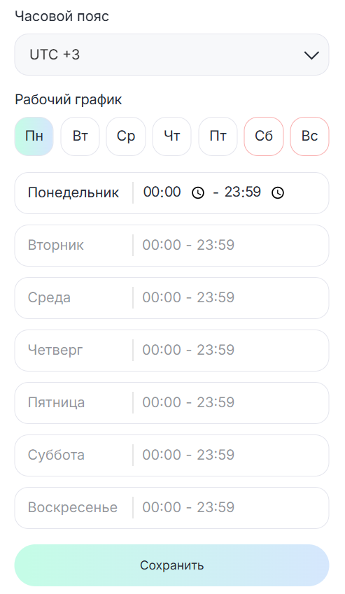 6. Выберите часовой пояс и настройте график работы. График можно ввести как вручную, так и через кнопку