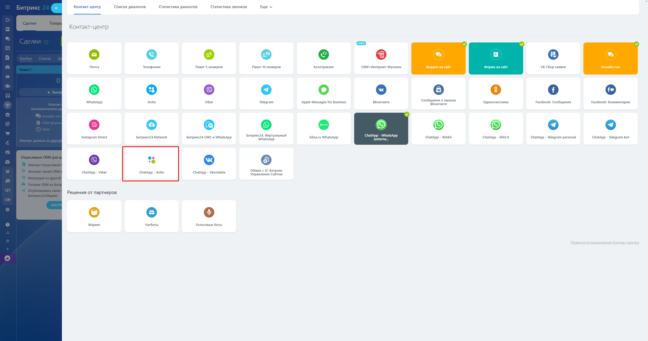 1. В разделе Контакт-центр на платформе Битрикс24, нажмите на коннектор — ChatApp — Avito.
