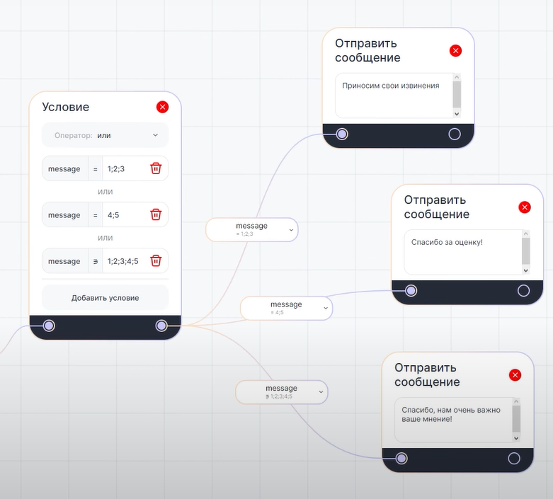 2. В блоке «Условие» указаны три варианта развития сценария в зависимости от выставленной клиентом оценки.